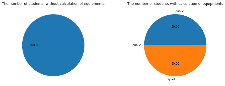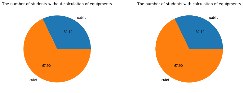 We also took the seat-switching situations as considerations. The number of students in quiet area in certain interval should be the sum of the number of current students, those who just arrive, and those who switch from the public area to the quiet area(named as switch_p2q in code). Same thing applies to the arrangement of the public area(in a variable called switch_q2p).