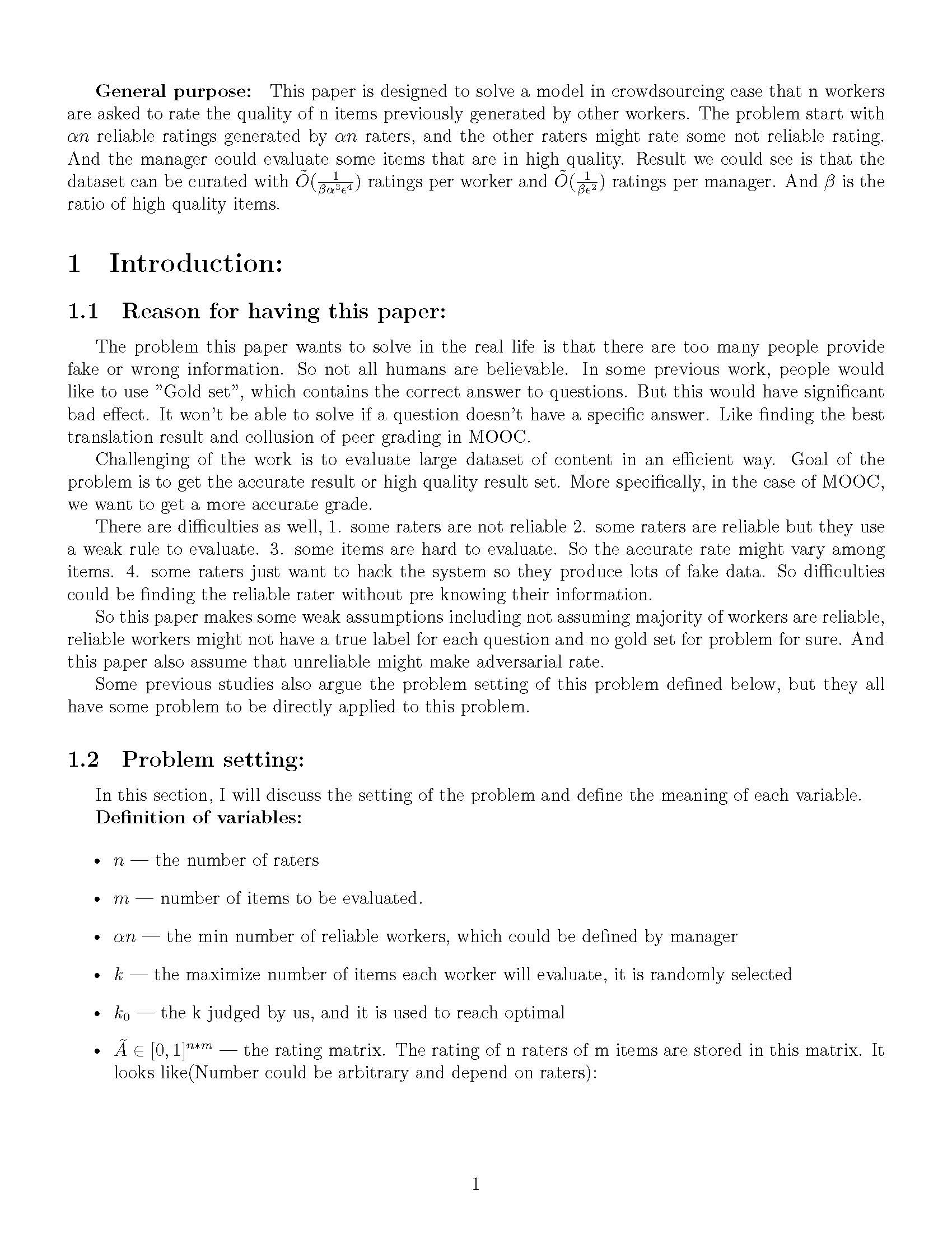In the final project of this course, I tried to focus on finding the correct product rating without golden set and read different papers. At last, I focused on Avoiding Imposters and Delinquents: Adversarial Crowdsourcing and Peer Prediction and write a reading report about it. The original file is in Latex, the following is the generated file. Click read more to see the detail.