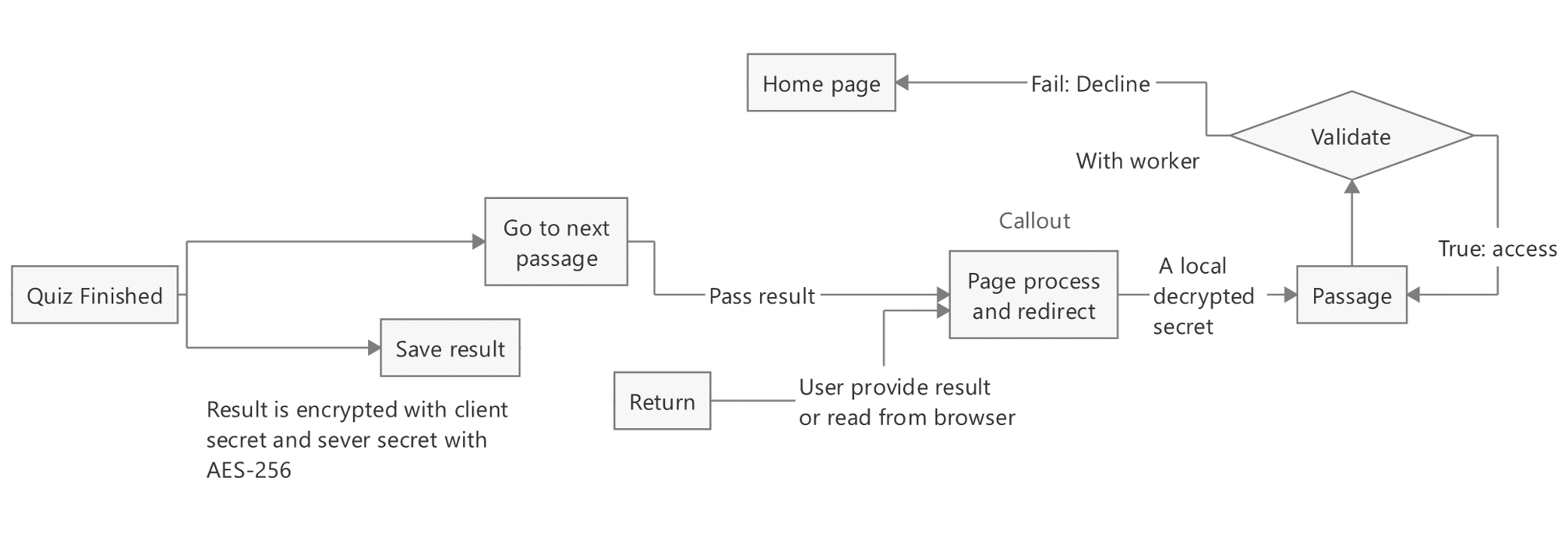 The design and running of the pointing system, like you get to finish one task before accessing the next one. Verification is done by passing a information that doesn’t contain any privacy information to cloudflare worker. And all information is encrypted by using a 256-bit keygen with AES-GCM