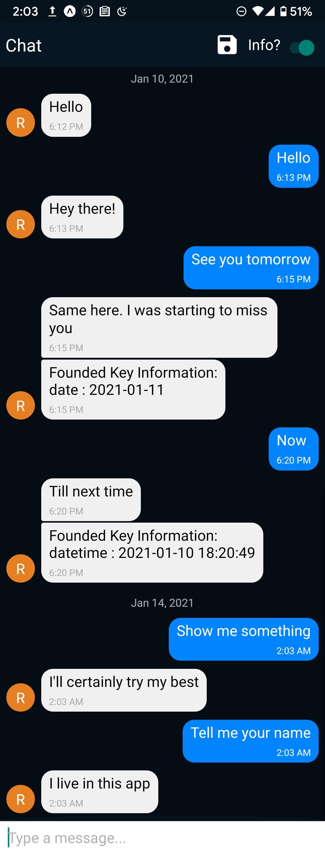 This is an robot chat app based on locally trained natural language processing model by using Nlp.js. It could answer questions in different situations and is able to run and answer questions based on context totally locally. Due to the limitation of the local dataset, it can only understand a limited number of phrase. It is still a good app to chat with. In each run, you can also choose to save history chat or not and choose to extract entity information or not. So, it is also a good app to see what a phrase will happen in react native version of Nlp.js in expo. Dark and light theme is following user’s system default. This app is done solely by me.